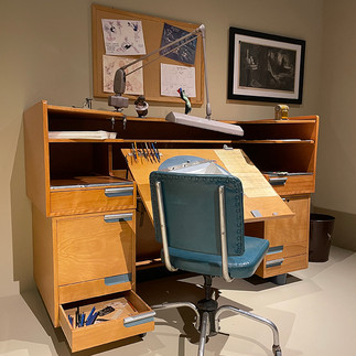 As you exit this room to the left of this cabinet, you enter a small hallway. The curators wanted to create a feeling of entering the archives and studio. The items that fill these halls are full of memories and reminders of the last hundred years. At the end of the hall is an animator's desk designed by Ken Weber that any artist or Disney animation fan would love to collect or utilize.